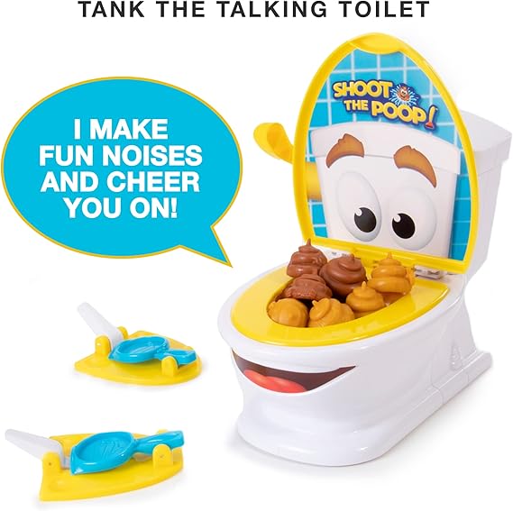 - No Plumbing Required: Includes a talking Tank the Toilet who’s flush with funny jokes, 12 plastic poop toys, and 2 launchers