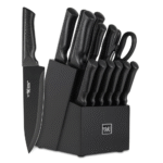 - ALL-IN-ONE KITCHEN KNIFE SET – 15-piece knife set includes. 8″ chef’s knife, 8″ slicing knife, 7″ Santoku knife, 8″ serrated bread knife, 5″ utility knife, 3.5″ paring knife, 6 4.5″ serrated steak knives, 1 kitchen shear, knife block with built-in knife sharpener